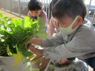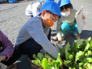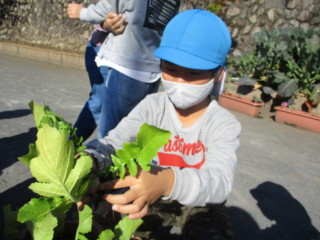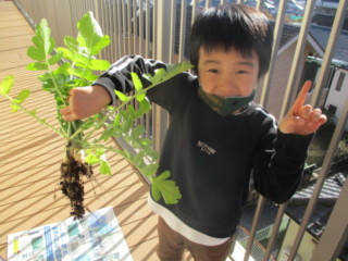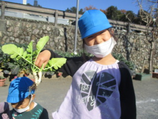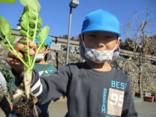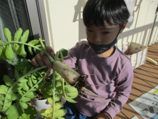 自分で新聞紙にくるむと、「花束みたい💐」「ママに可愛いお土産ができたよ」と嬉しそうに持ちかえりました。次の日には、大根の葉をお味噌汁に入ってたよ、斜めに切ったりして食べたよ と嬉しい報告も聞かれました。小さな大根を料理するのはなかなか手間がかかったと思いますが、お家の方と一緒に食べる事ができて、子ども達は満足していたようです。