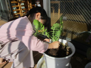 畑・プランター・場所を変えて保育室前のプランターで育て、葉の大きさや、虫の付き具合、土の近くに見える大根の大きさなど比べてみました。