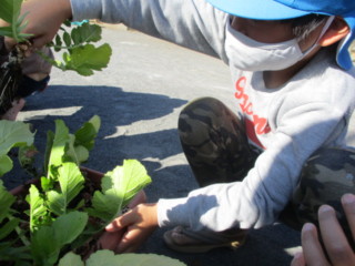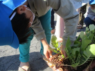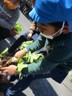 今日は小さめのプランターの大根を収穫したため、すんなり抜け、子ども達は「かわいいね」と言いながら、お友だちの物と比べたり、二本同時に抜いて「兄弟だ」「双子みたいだね」と楽しんでいました。畑で育っている大きな大根と同じものだということは、次回の収穫の時に気づくかしら・・・。楽しみです。