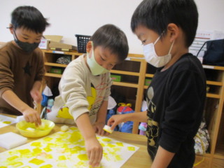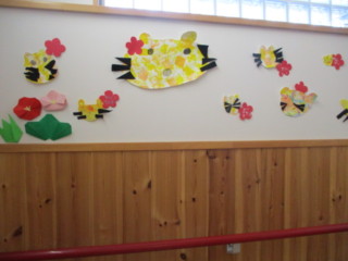 枝を使って「2022」の垂れ幕を作ったり、プチプチを使って「なりきりタイガー」を作ったり、スタンプを使って「壁面装飾の寅」まで作りました!