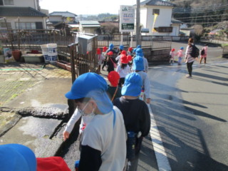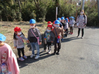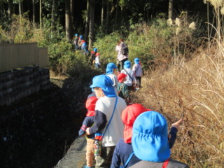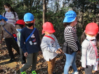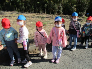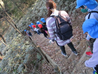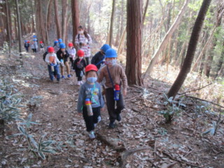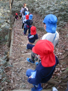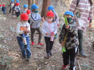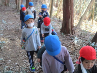 キノコや、自然物を見つけに、年長と年少でペアーになって山散歩に出掛けました。