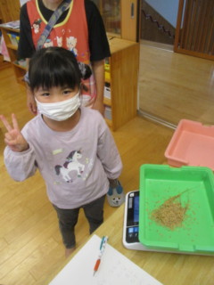 せっかく量について競ったり、関心を持ってくれたので、給食室から秤を借りてきて、一人一人計っていきました。