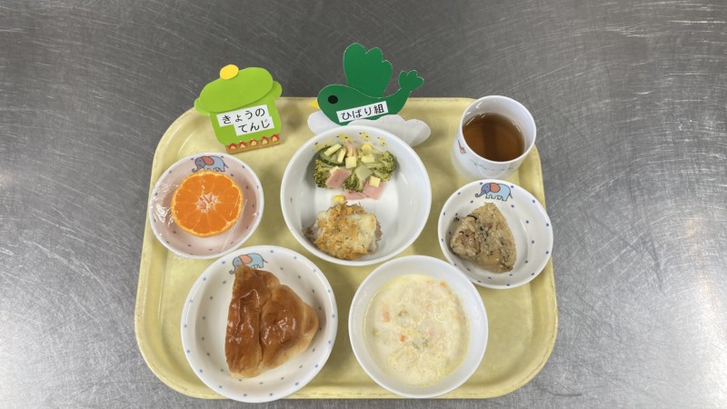 ◎給食 主食:ロールパン 汁物:白菜のミルクスープ 主菜:シェファーズパイ 副菜:イタリアンサラダ 果物:みかん