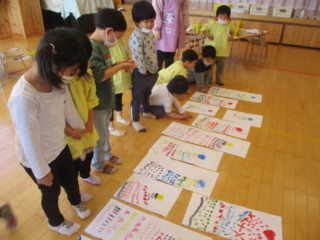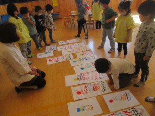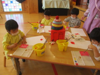 帽子の色は自分たちで確認し、「次は紫かぁ…何色混ぜるんだっけ?」とお友だちと確認しあいながら進めていきました。