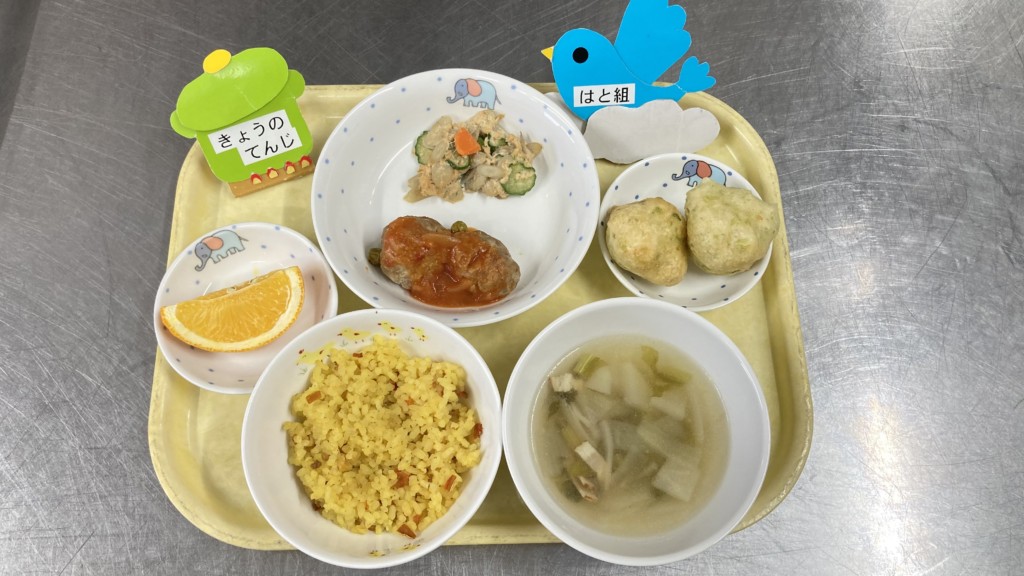 ◎給食 主食:ドライカレー ※防災備蓄使用 汁物:かぶとベーコンのスープ 主菜:ミートボール 副菜:ごぼうサラダ 果物:夏みかん