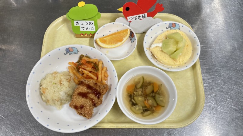 ◎給食 主食:海老ピラフ 汁物:ズッキーニのきのこスープ 主菜:ミルフィーユカツ 副菜:マカロニソテー 果物:バレンシアオレンジ