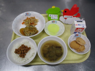 ◎給食 主食:納豆ご飯 汁物:みそ汁(なす・玉葱) 主菜:和風つくね 副菜:もやしの胡麻和え デザート:ゼリー(グレープフルーツ味)