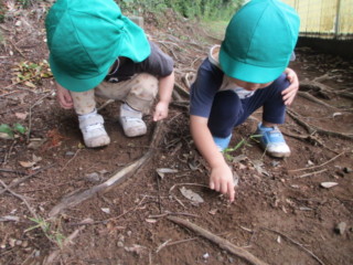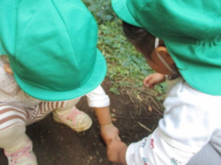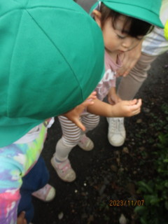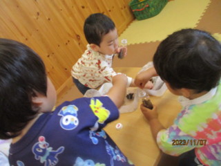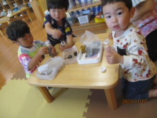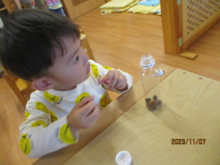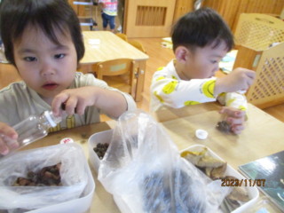 秋の山散歩や、園周辺散歩を通して、たくさんの木のみを収集してきたひばりちゃん!