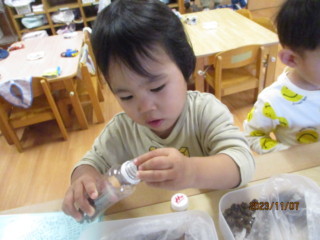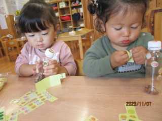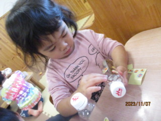 ペットボトルの開閉や、木の実をつまんで入れたり、シールを貼ったり・・・