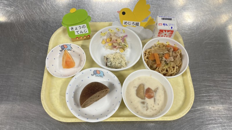 ◎給食 主食:キャロブパン 汁物:シチュー(防災食) 主菜:魚のチーズパン粉焼き 副菜:キャベツサラダ 果物:柿