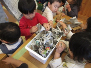 紙の鬼に投げるために新聞紙でお豆作り・・・