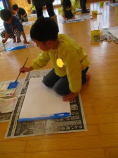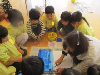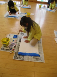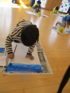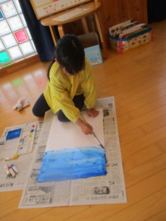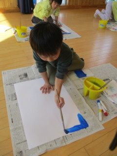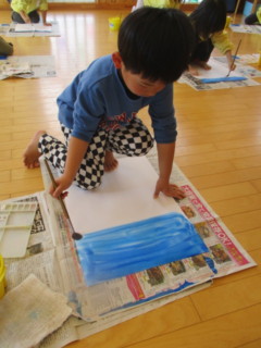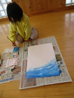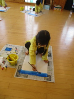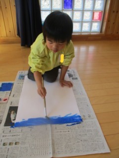 大きな白い画用紙に青い絵の具でダイナミックに塗っていきました🎨