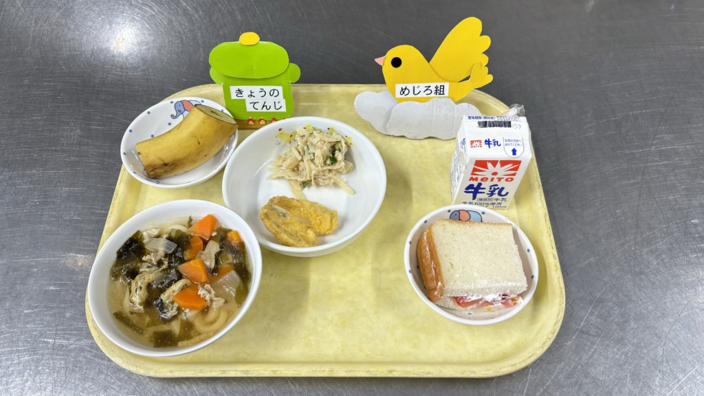 ◎給食 主食:磯うどん 主菜:きすの天ぷら 副菜:大根サラダ 果物:バナナ