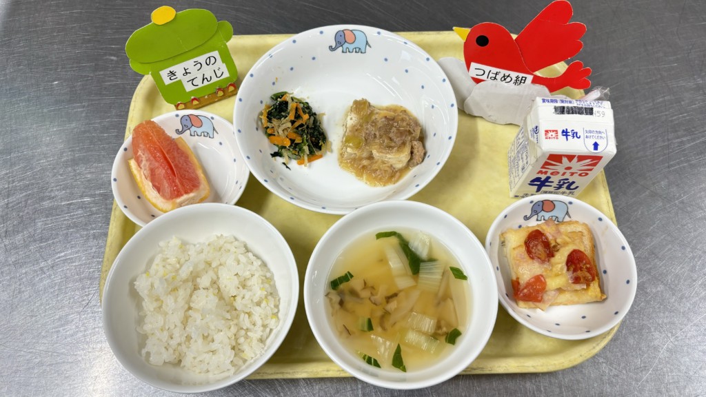 ◎給食 主食:五穀米ごはん 汁物:春雨スープ 主菜:肉豆腐 副菜:野菜のナムル 果物:グレープフルーツ