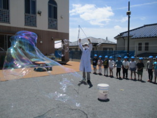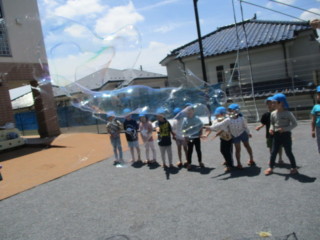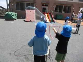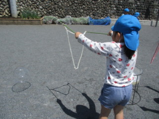 今日は風があちこちから吹いてくるものだから子ども達もクルクル回りながら風をとらえてシャボン玉を作っていました
