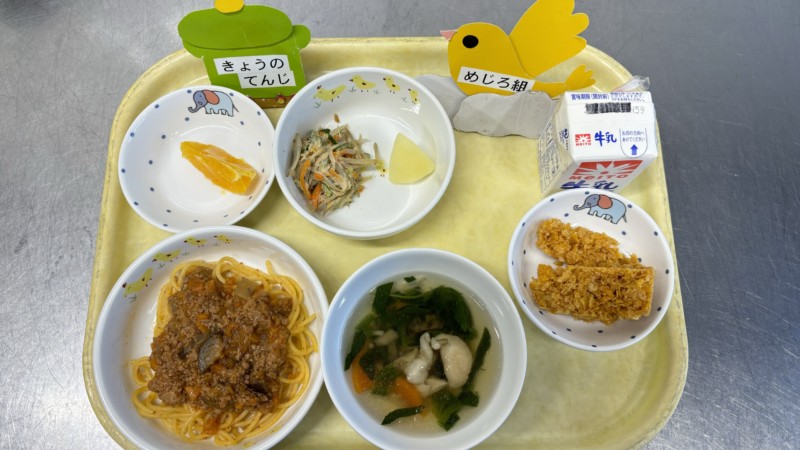 🌱みんな大好きミートソーススパゲッティ。ごぼうサラダは嚙み応えがあるので苦戦するかと思いましたが、スパゲッティのおかげかどのクラスもあっという間に食べ終わったようです😊