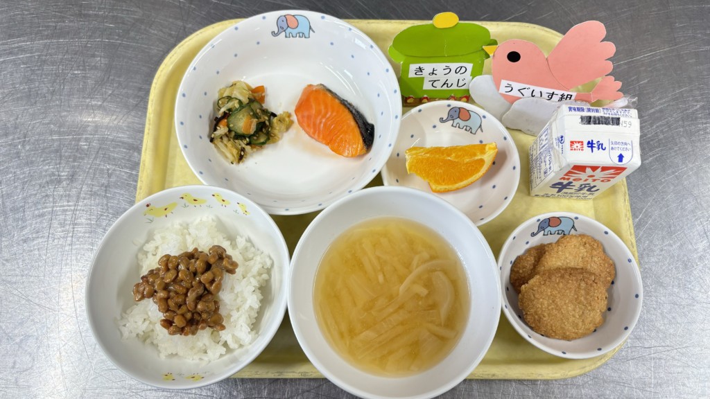 ◎給食 主食:納豆ご飯 汁物:味噌汁(大根・玉葱) 主菜:焼き魚(鮭) 副菜:野菜の塩昆布和え 果物:オレンジ