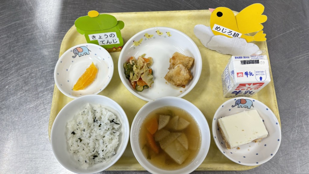 ◎給食 主食:わかめご飯 汁物:けんちん汁(防災備蓄) 主菜:カジキマグロのから揚げ 副菜:春キャベツのさっぱり和え 果物:オレンジ *都合により変更となりました