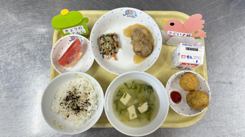 ◎給食 主食:ふりかけご飯 汁物:豆腐の中華スープ 主菜:肉団子の味噌煮 副菜:ひじきサラダ 果物:グレープフルーツ