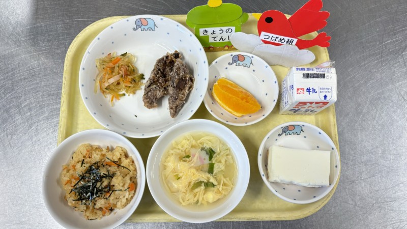 ◎給食 主食:炊き込みご飯 汁物:かきたま中華風スープ 主菜:レバーの竜田揚げ 副菜:春雨サラダ 果物:オレンジ