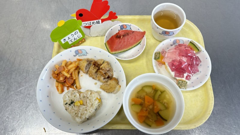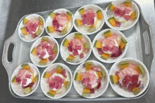 🍈今日のメニューはみんなよく食べてくれていてお部屋に行った時にはもうお皿が空っぽの子もいたぐらいよく食べていました😋ミルフィーユカツ美味しいっていってくれていました!!今月のケーキは紫陽花をモチーフにし、イチゴとぶどう味のゼリーを作り、スポンジを焼き、かために作った生クリームをのっけて四角く切った2種類のゼリーを生クリームの上にかぶせてメロンを周りに添えたら出来上がりです♪