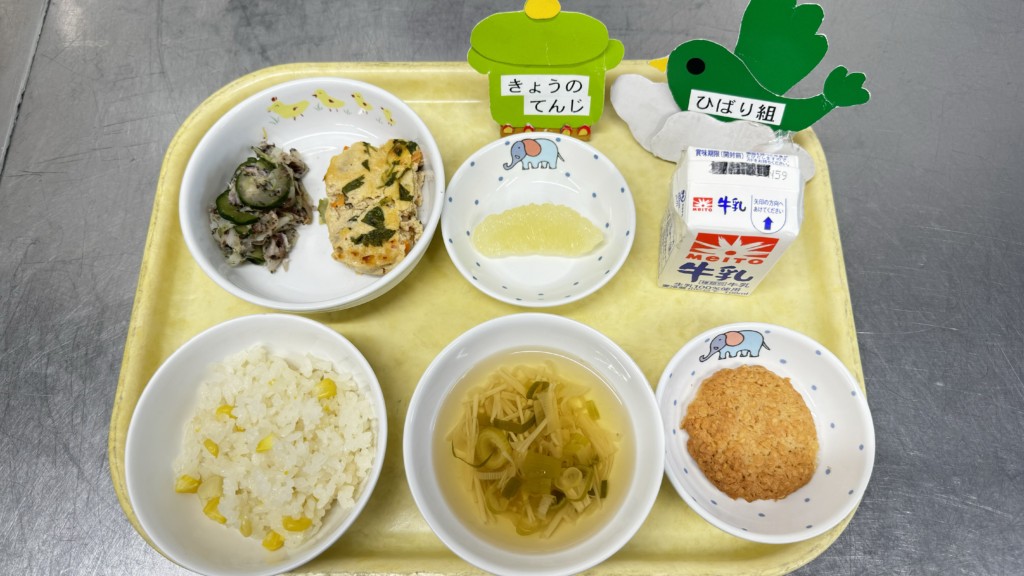 ◎給食 主食:とうもろこしご飯 汁物:すまし汁(ねぎ・えのき) 主菜:ぎせい豆腐 副菜:野菜のゆかり和え 果物:グレープフルーツ