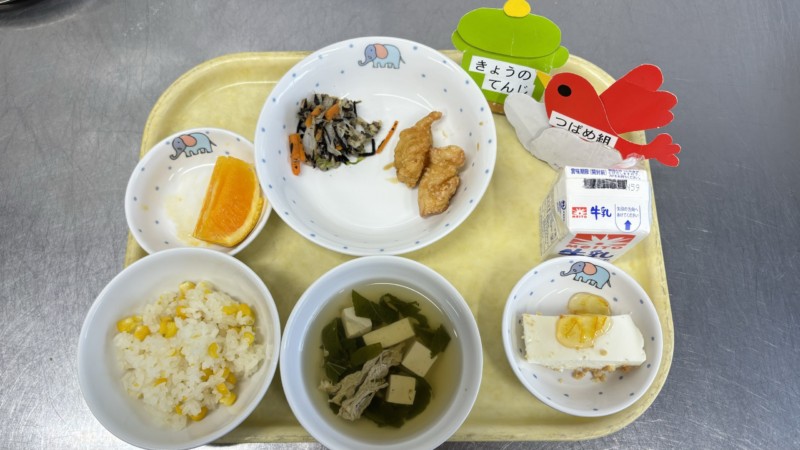 ◎給食 主食:とうもろこしご飯 汁物:モロヘイヤのスープ 主菜:ささみの甘辛レモン味 副菜:ひじきのツナ醬油和え 果物:オレンジ