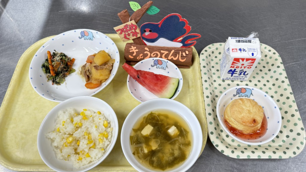 ◎給食 主食:とうもろこしご飯 汁物:みそ汁(豆腐・葱・若布) 主菜:肉じゃが 副菜:和え物 果物:スイカ(都合により梨からスイカに変更しています)
