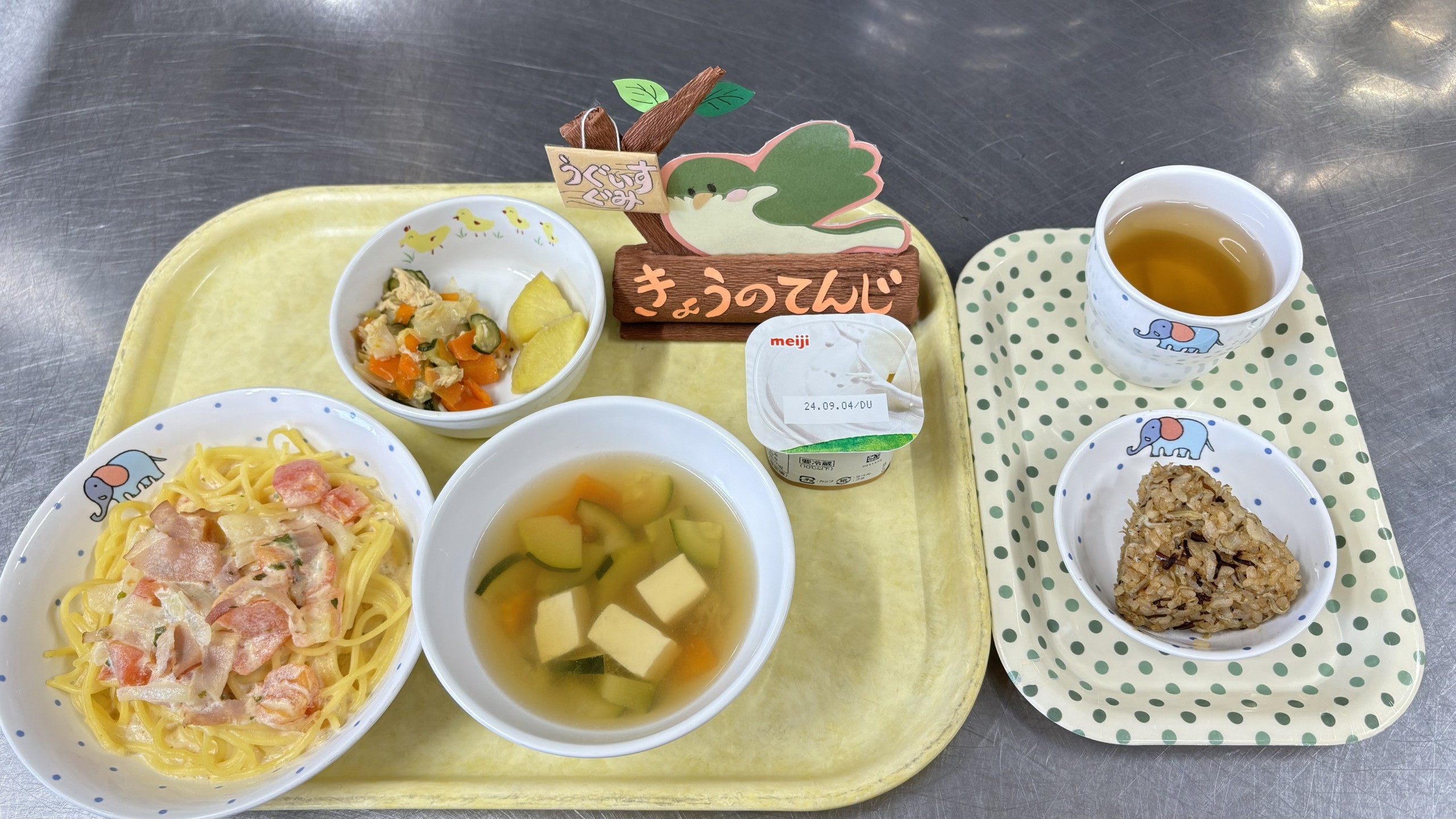 ◎給食 主食:トマトクリームパスタ 汁物:ズッキーニのスープ 副菜:チキンサラダ 副菜:さつま芋の甘煮 デザート:ヨーグルト