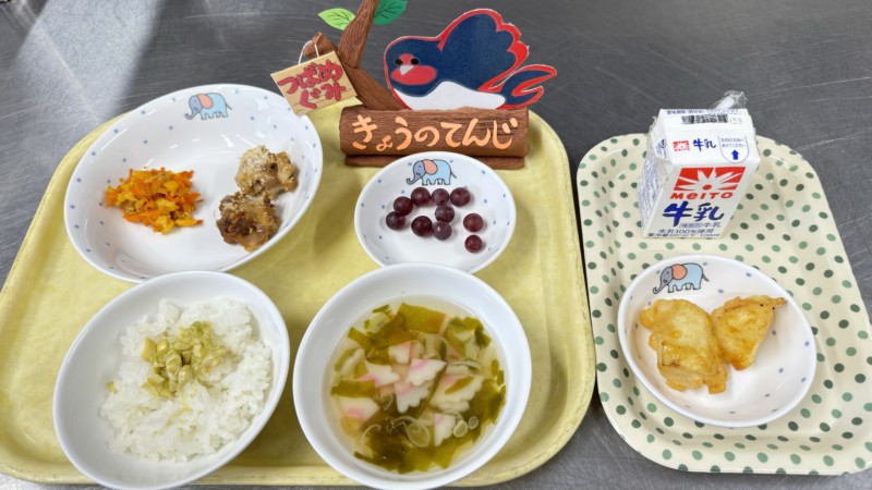 ◎給食 主食:枝豆ご飯 汁物:わかめとなるとのスープ 主菜:豚肉のさざれ焼き 副菜:にんじんとツナのしりしり 果物:ぶどう