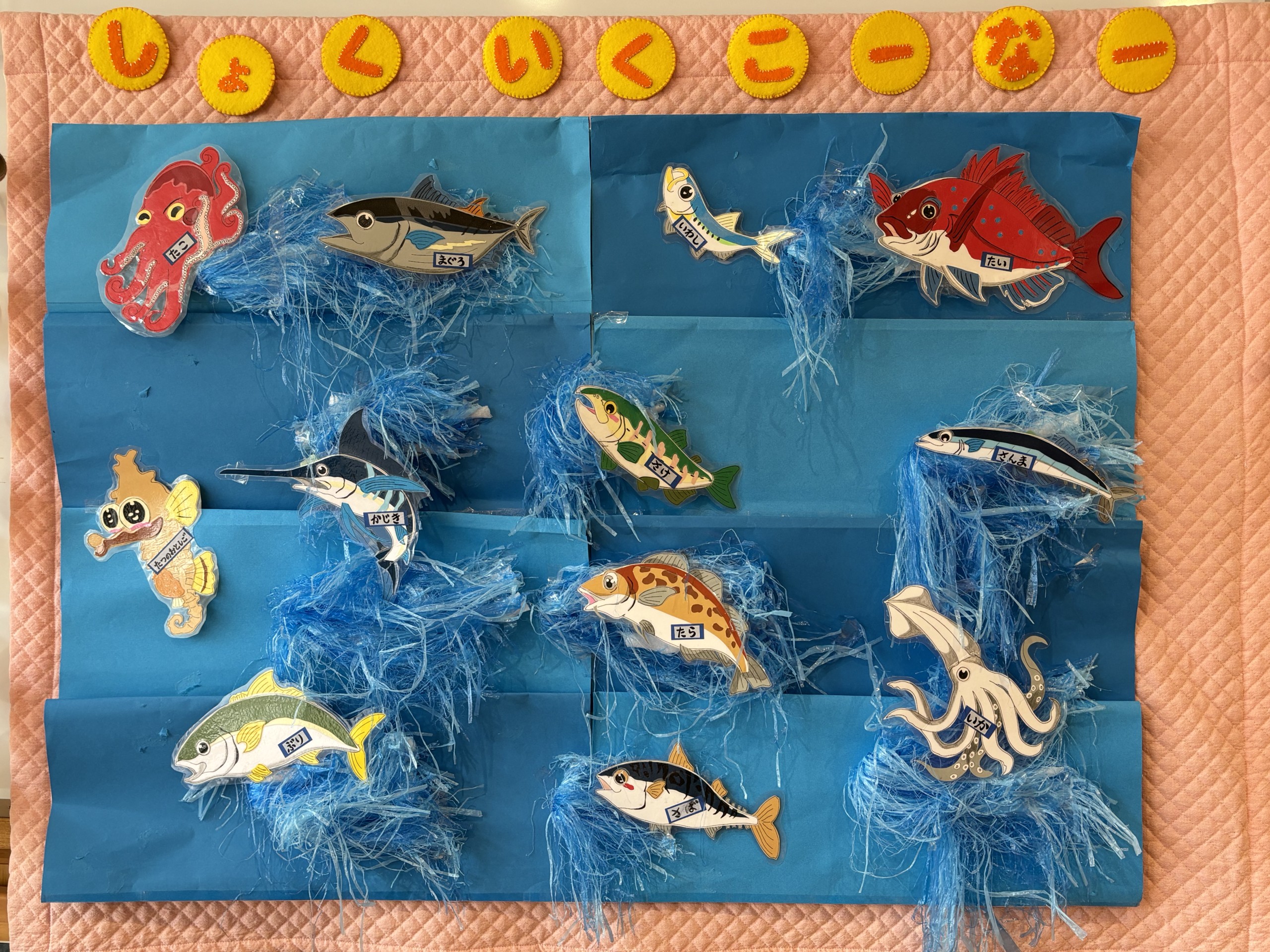 8月にはいり保育園の玄関は海の中のようです。天井からは子どもたちの作ったさかなのモビールがゆらゆら・・・ 食育コーナーではさかなのイラストが泳いでいます それぞれ特徴がちがうので見比べてくださいね🐟 あそべるおすしやさんも開店しています🍣 みんなはどんなお寿司が好きなのかな?