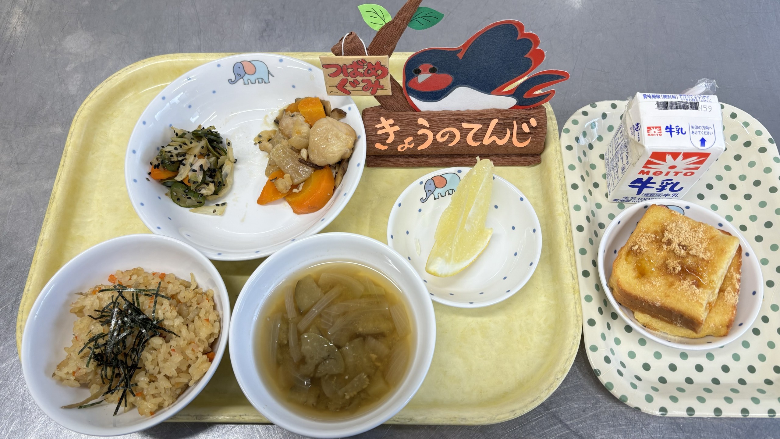 ◎給食 主食:かやくご飯 汁物:味噌汁(なす・玉葱) 主菜:鶏と大根の煮物 副菜:野菜の胡麻和え 果物:グレープフルーツ