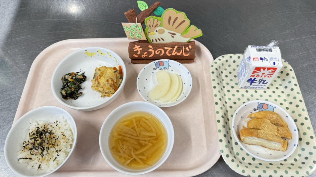 ◎給食 主食:ふりかけご飯 汁物:味噌汁(大根・もやし) 主菜:ぎせい豆腐 副菜:ほうれん草のひじきサラダ 果物:梨
