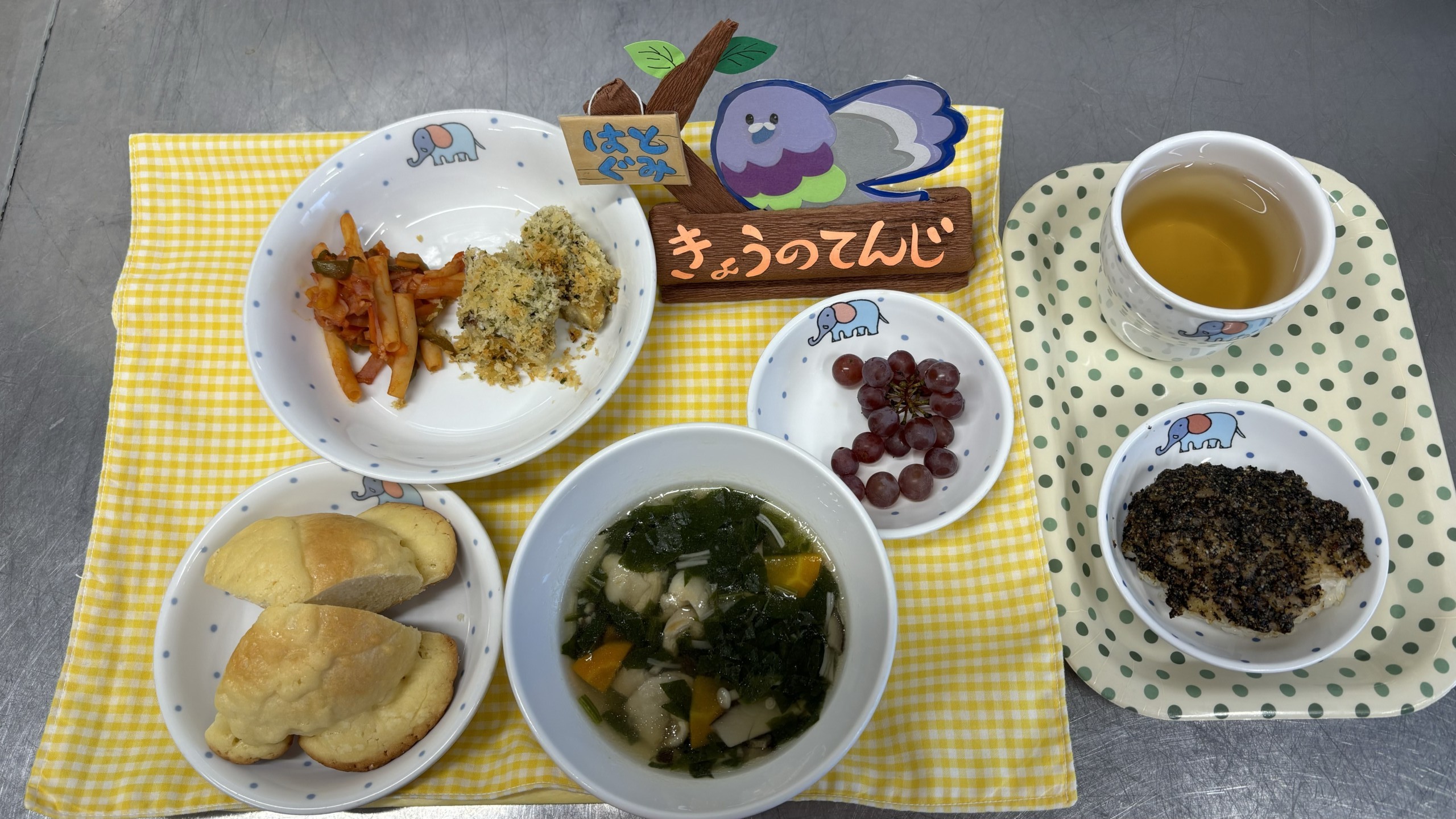 ◎給食 主食:メロンパン 汁物:チキンスープ 主菜:魚のパン粉焼 副菜:マカロニソテー 果物:ぶどう