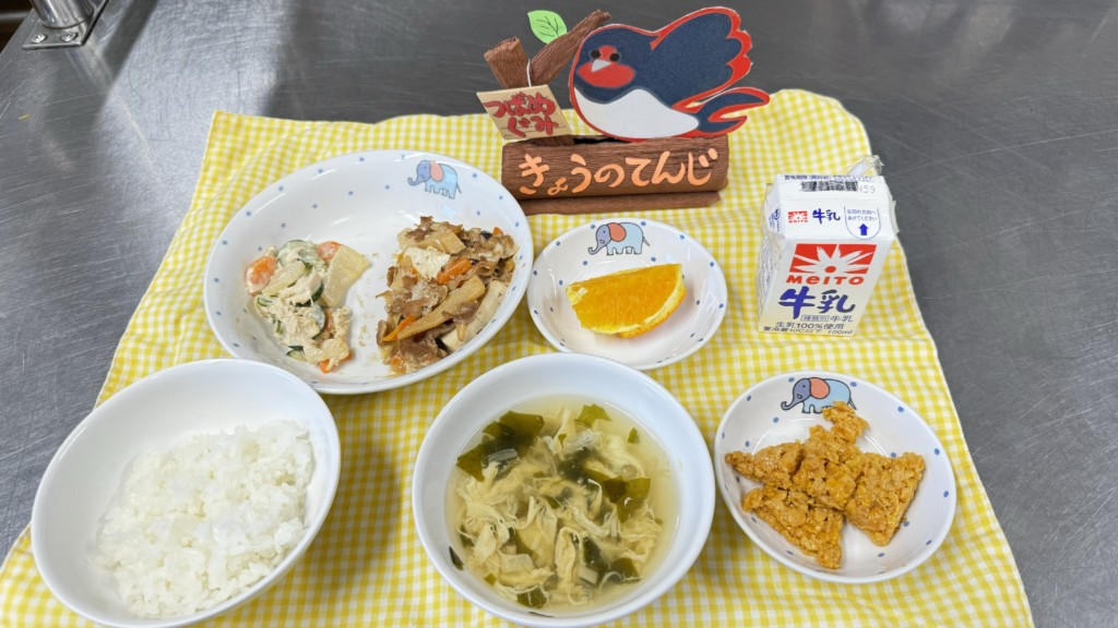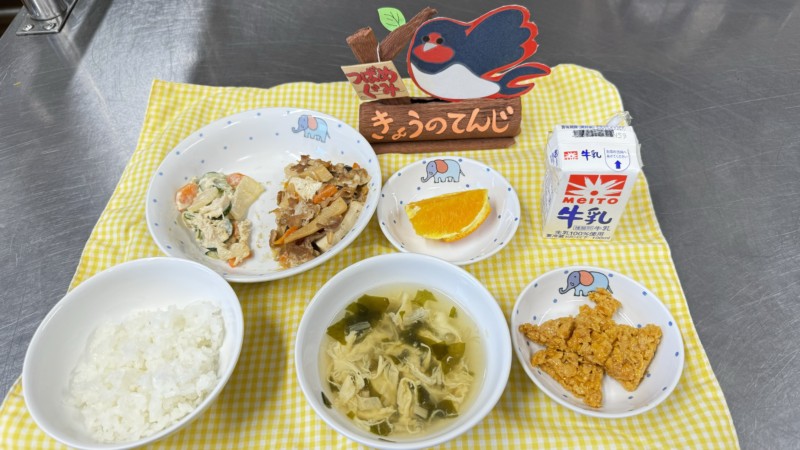 ◎給食 主食:ごはん 汁物:卵とえのきのスープ 主菜:豆腐の中華煮 副菜:ささみと大根のサラダ 果物:オレンジ