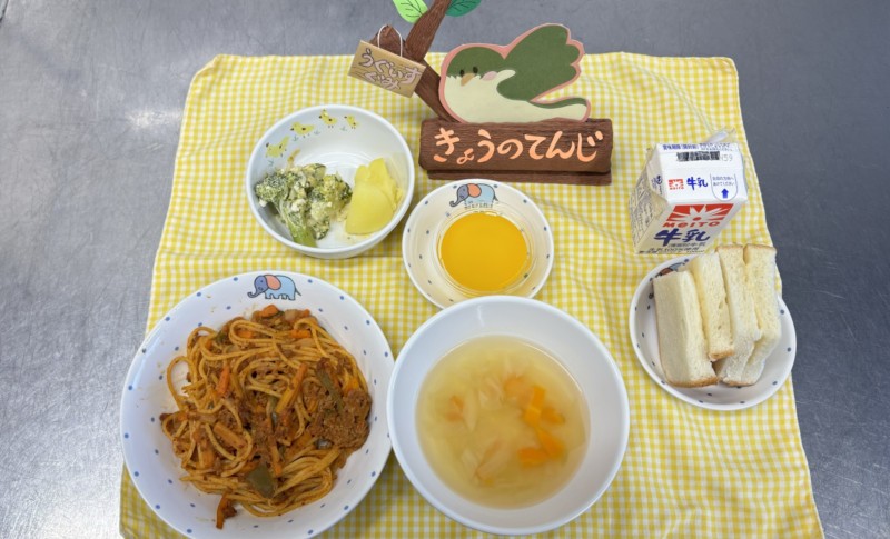 ◎給食 主食:インディアンスパゲティ 汁物:野菜スープ 副菜:ブロッコリーと卵のサラダ 副菜:こふき芋 デザート:ゼリー(オレンジ)