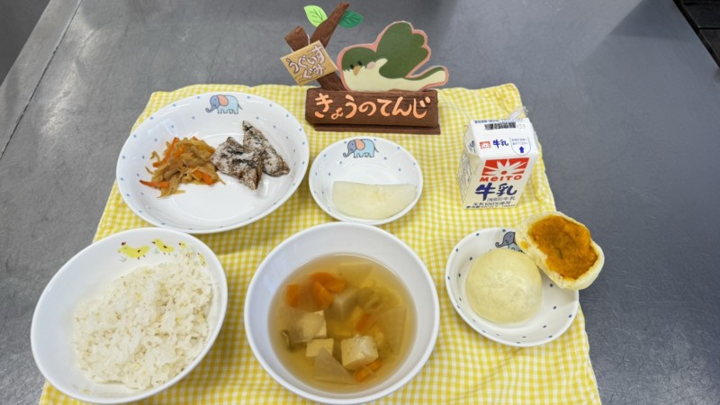 🍇今日は中秋の名月(十五夜)です🌕行事食でけんちん汁!そして秋のサンマ♪おやつにはお月様に見立てたかぼちゃまんじゅうにしました!!みんなよく食べてくれていました😊