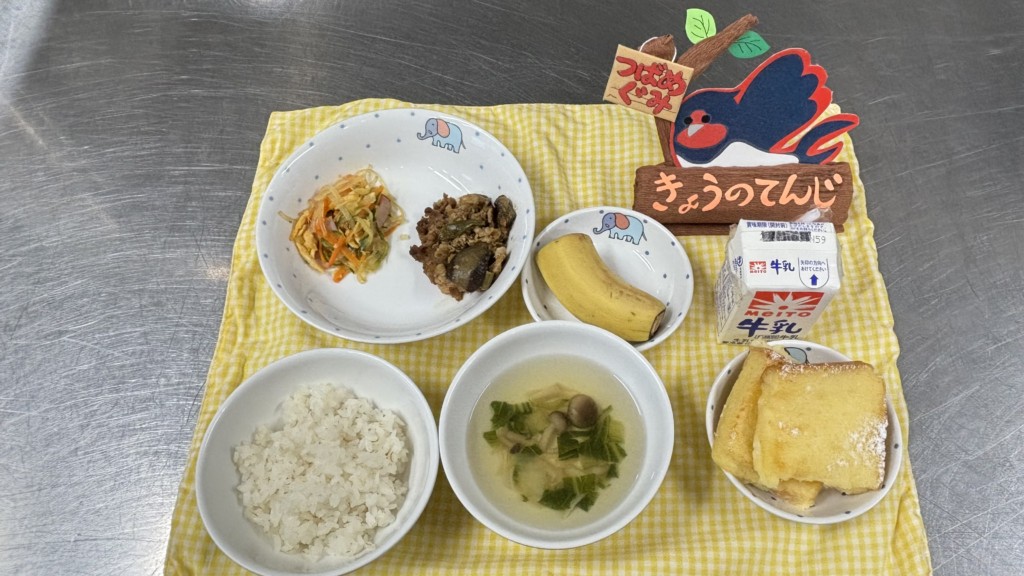 ◎給食 主食:もち麦ご飯 汁物:青梗菜ときのこのスープ 主菜:なすと豚肉の炒め物 副菜:五色サラダ 果物:バナナ