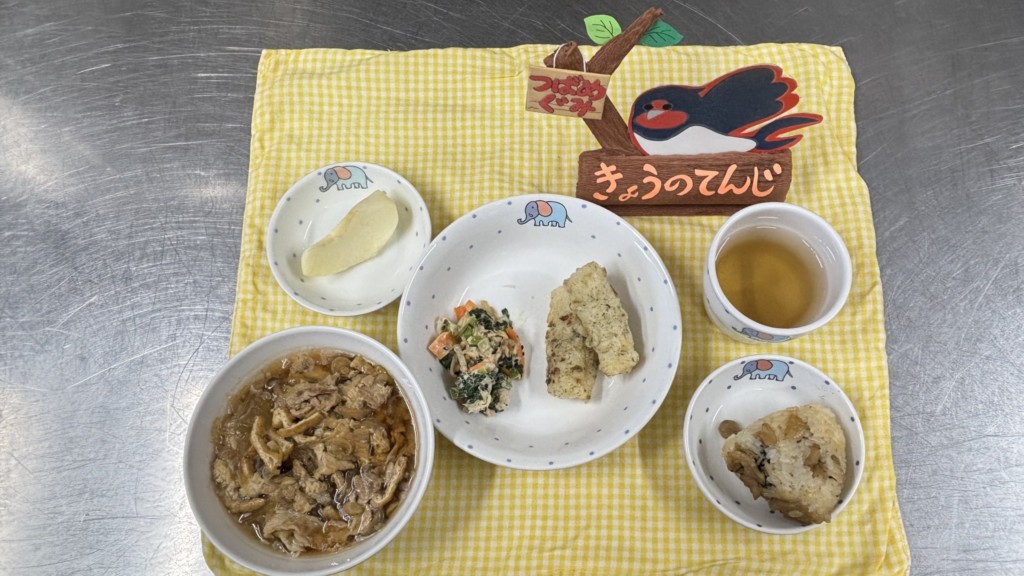 ◎給食 主食:肉うどん 主菜:ちくわの磯辺揚げ(乳児クラス:タラ磯辺揚げ) 副菜:小松菜のごまネーズ和え 果物:りんご