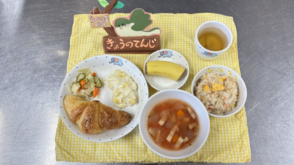 ◎給食 主食:クロワッサン 汁物:ミネストローネスープ 主菜:白身魚のクリーム煮 副菜:フレンチサラダ 果物:バナナ