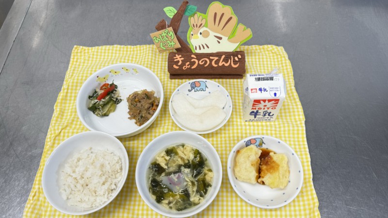 ◎給食 主食:もち麦ご飯 汁物:かきたまスープ 主菜:麻婆春雨 副菜:しらす入り中華サラダ 果物:梨