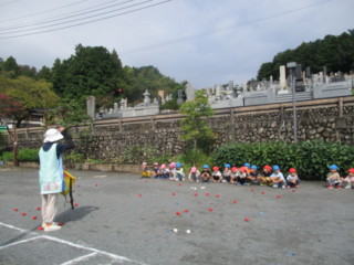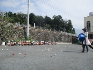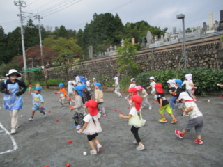 カラーチームと白チームに分かれて、逃げるカゴを追いかけながら玉入れをします!