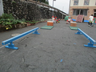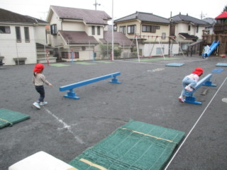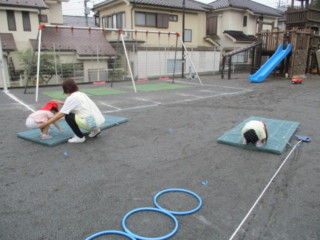 体育指導で習ってきたマット運動(前転)、平均台、跳び箱(台上ジャンプ)を頑張っています。