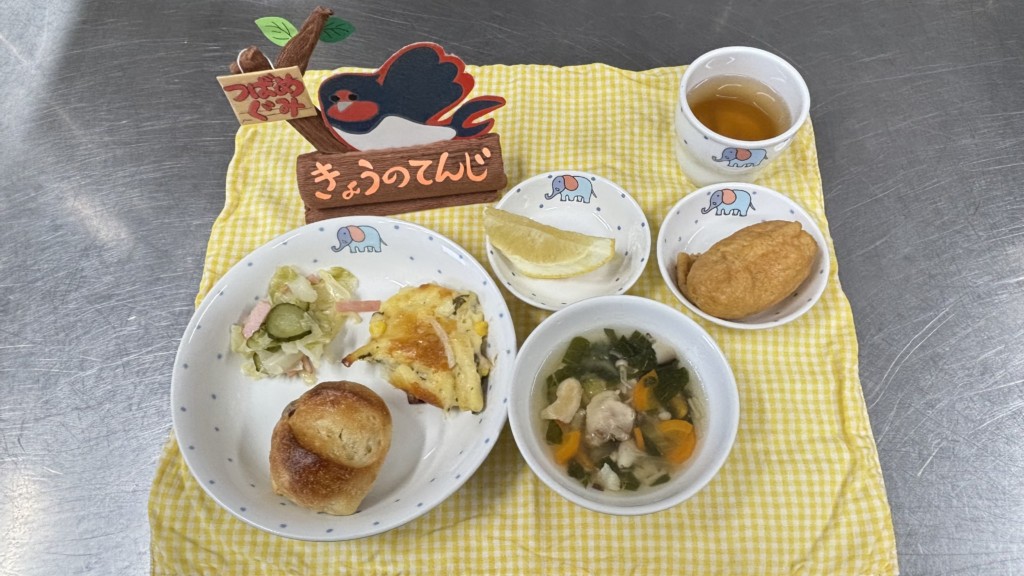 ◎給食 主食:干しいもパン 汁物:チキンスープ 主菜:マカロニグラタン 副菜:キャベツとハムのサラダ 果物:グレープフルーツ