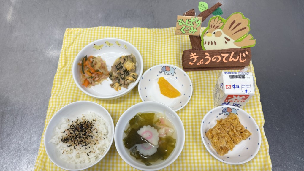 ◎給食 主食:ふりかけごはん 汁物:わかめとなるとのスープ 主菜:豚肉と青梗菜の炒め物 副菜:春雨サラダ 果物:オレンジ