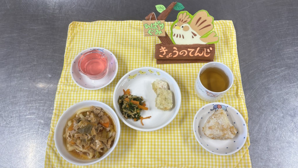 ◎給食 主食:肉うどん 主菜:ちくわの磯部揚げ(幼児クラス) タラの磯部揚げ(乳児クラス) 副菜:胡麻和え デザート:ゼリー(イチゴ味)