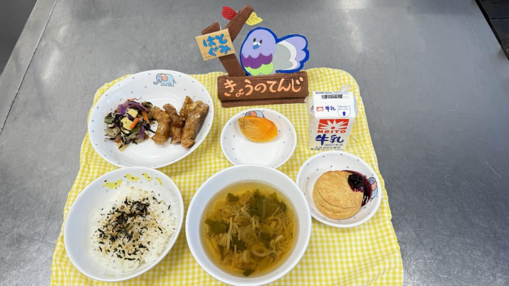 ◎給食 主食:ふりかけごはん 汁物:すまし汁(葱・えのき) 主菜:豚肉のかりん揚げ 副菜:七色サラダ 果物:柿