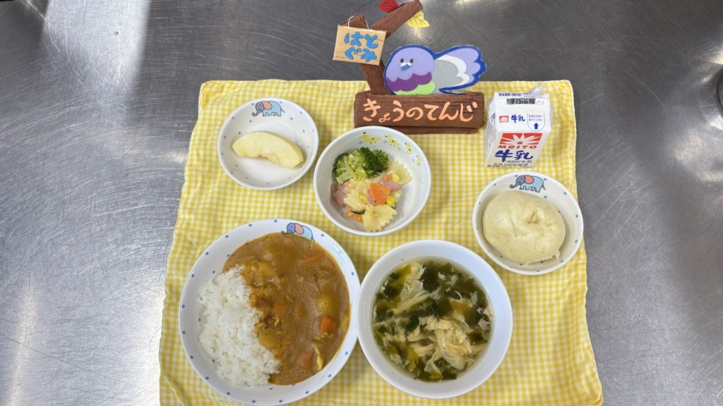 ◎給食 主食:カレーライス 汁物:わかめと卵のスープ 副菜:ちょうちょサラダ 副菜:ブロッコリーボイル 果物:りんご