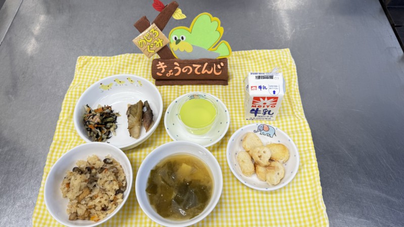 ◎給食 主食:きのこご飯 汁物:味噌汁(さつま芋・玉ねぎ・若布) 主菜:鯖の塩焼き 副菜:ひじきの醤油和え デザート:ゼリー(マスカット味)