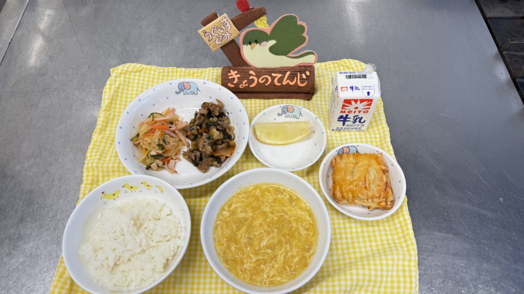 ◎給食 主食:ごはん 汁物:コーンスープ 主菜:プルコギ 副菜:春雨サラダ 果物:グレープフルーツ